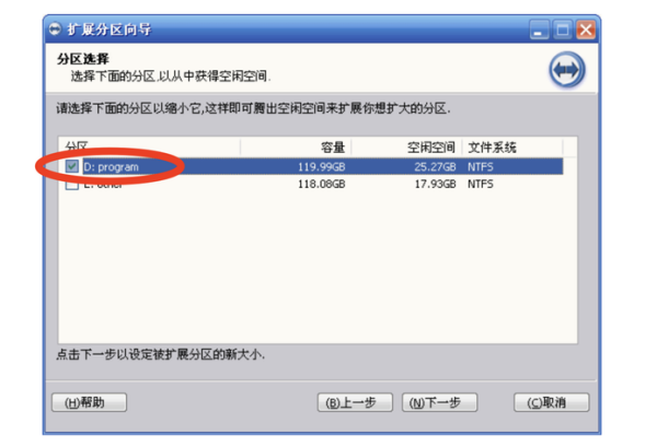5、这个页面需要你来选择你要缩小的分区,电脑的空间大小是固定的,扩大C盘的容量,就一定会缩小某个分区的容量。从图中的列表中选取一个你认为合适的分区即可。这里我们选择缩小地盘的空间来扩大C盘,然后点击下一步。
