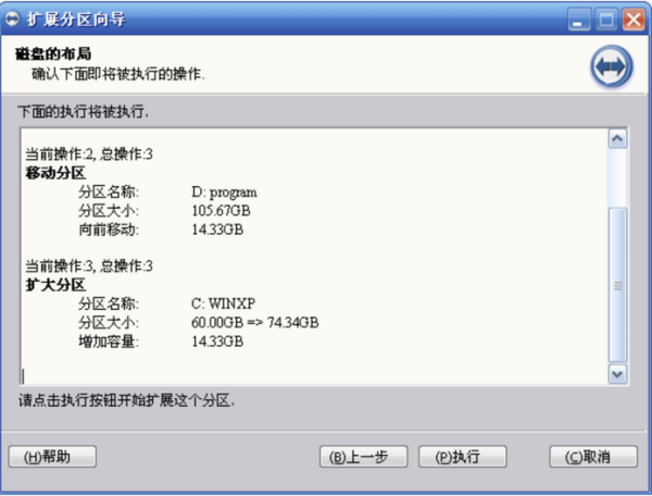 7、该步骤会显示C盘扩大会执行什么操作,点击执行,程序就会按照显示的执行进行执行操作,程序执行完成后C盘的空间就会扩大到我们之前设定的值。