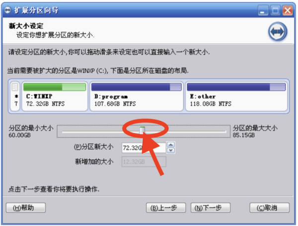 6、在该步骤我们可以通过滑动按钮来选择C盘扩大之后的容量大小,这里的大小可以自己视情况来调节,调节好之后点击下一步。