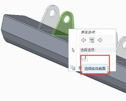4、然后按右键,选择实体曲面,将这个零件的表面选中。