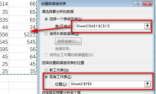 3、点击插入数据透视表后,选中区域中就框选数据,然后选择一个要放置透视表的位置。