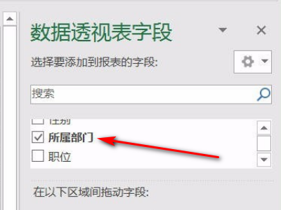 3、此时即可新建一个工作表,显示数据透视表框架,在【设置数据表字段】窗口选中【所属部门】选项,即可将【所属部门】字段添加到数据透视表表格中。