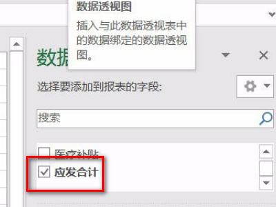4、用同样方法,在【设置数据表字段】窗口选中【应发合计】选项,即可将【应发合计】字段添加到数据透视表表格中。