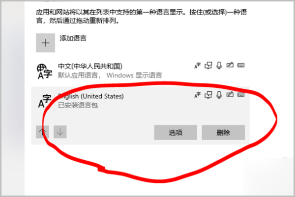 8、然后看下面的首选语言。鼠标左键点一下会出现↑↓箭头,把英文(美国)向下移动,然后再重复点击一下中文(中华人民共和国)和英文(美国),这时删除图标不是灰色的了,就可以删除了