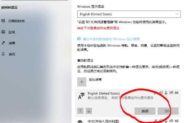 4、安装完成以后,回到语言设置,在添加English里点选项。