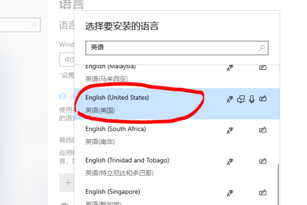 3、在搜索中输入,English,选择英语(美国),点击下一步添加他。这时,系统会默认下载语言包,耐心等待下载安装完毕。