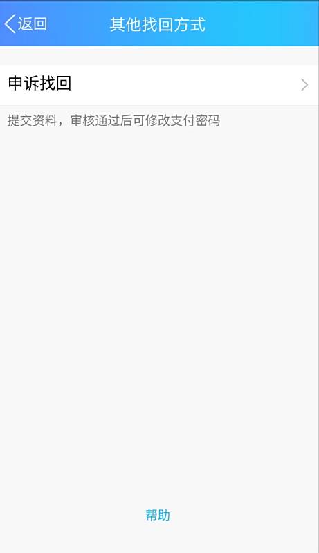 (4)如遇其他情况,点击右上角的无法找回,里面有一个申诉找回,按照步骤来,申诉成功后,就可以重新设置支付密码了。