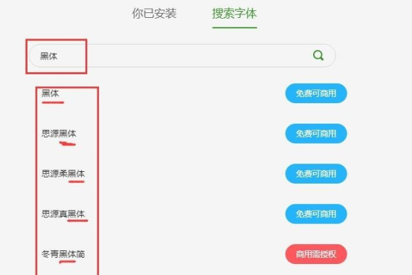 7、如图所示,黑体的搜索结果如下,会列出所有字体名称包含“黑体”二字的字体,有的是免费的,有的是需要版权的。