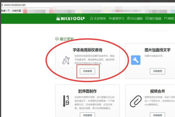 2、进入该网站后,可以看到里面提供了非常多的小工具,要不网站名字怎么叫好工具呢。如图所示,找到红色框中的“字体商用版权查询”工具,然后点击【开始使用】。