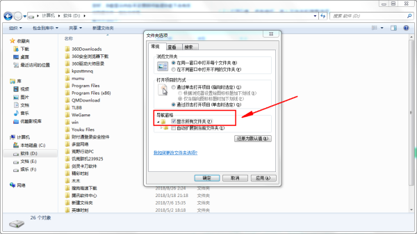 (3)在导航窗格下勾选显示所有文件夹。这样就能看到隐藏的文件夹了。