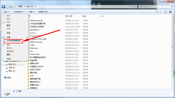(2)打开D盘,点击组织,进入文件夹和搜索选项。