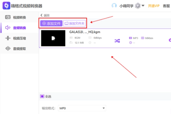 2、点击【添加文件】,把准备好的mgg文件上传到软件中,或者直接将文件拖入软件页面内。
