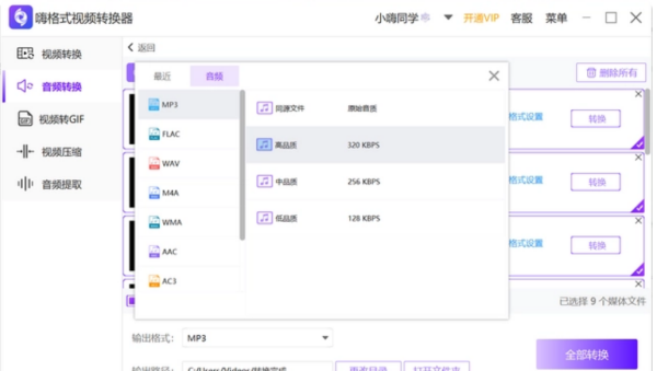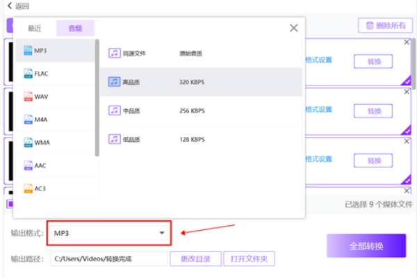 在转换设置中,选择“MP3”作为转换格式,并调整其他参数,如果需要的话。