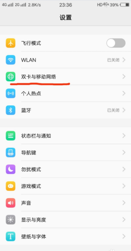 2、进入设置页面后点击进入双卡与移动网络选项页面。