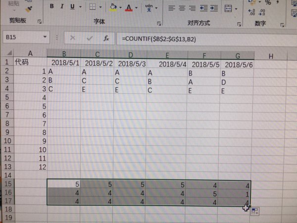 COUNTIF函数共两个参数,第一个参数:条件区域,也就是需要被判断的数据区域,这里因为需要公式向下及向右填充,而这个区域又需要保持不变,所以在行列号全面加了$符号作为绝对引用;