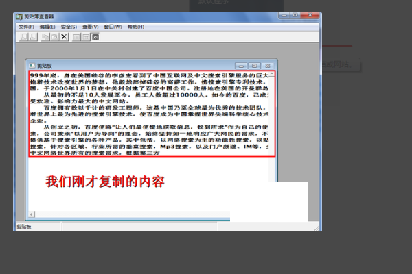 5、再次打开这个剪贴板查看器,会发现在刚才的空白框中,出现了所复制的文字内容。其实这段内容就是保存在内存中的,可以将之粘贴到其他地方。所以,当系统剪贴板内容较多时,会占用较多的系统内存,就是这个原理。
