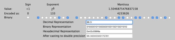因为如上原理,93.6 不能被计算机精确地存储为 96.3,而是一个 96.3 的近似值(实际是96.30000305175781)。下图是 float 类型的 96.3 在计算机内存中的实际存储方式: