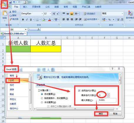 第一步:单击“文件”选项卡→“Excel选项” →“公式”,勾选“启用迭代计算”复选框,设置“最多迭代次数”为1(“1”表示每一次工作表重新计算,将执行一次累加。)→“确定“;