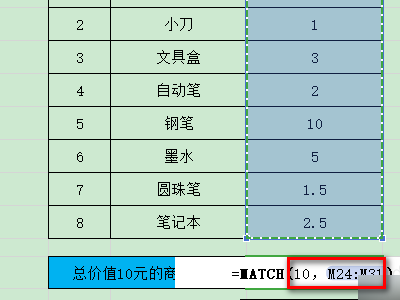 5、然后匹配类型为0,此时函数为:=MATCH(10,M24:M31,0),最后点击回车键,函数自动计算结果,如图所示。