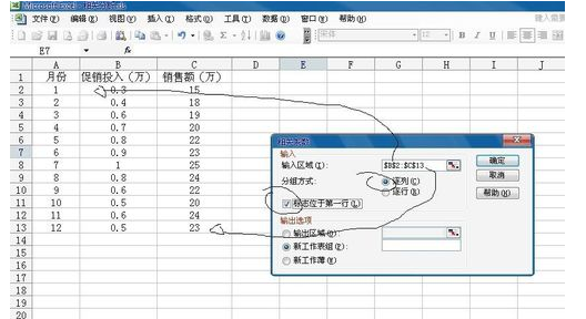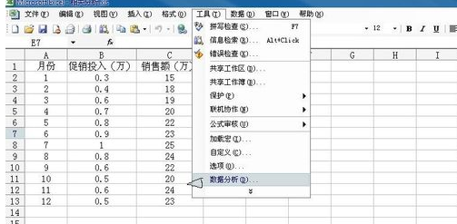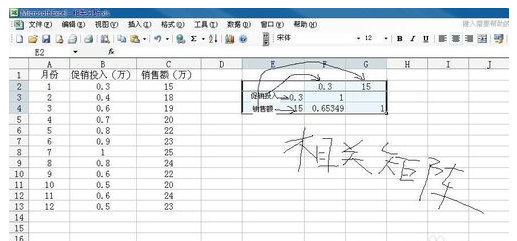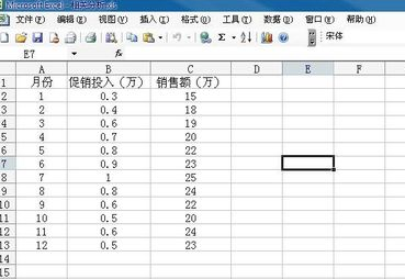 1.输入要分析的数据,这里以分析促销和营业额的关系为例进行。数据如下图。