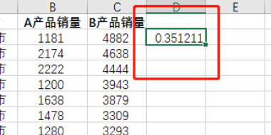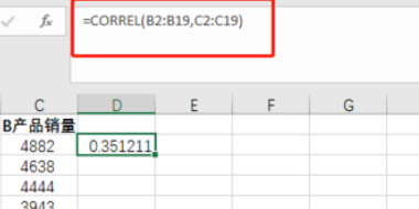 5、使用这个CORREL函数之后,得到0.351211这样的数值。这个值越接近1,那就说明相关性越大;越接近0,说明相关性越小,不相关。从这两组数据来看,A、B两个产品销量的相关性并不强。