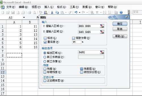 2、选择“工具”——“数据分析”——“回归”,出现一个对话框,做如下设置: