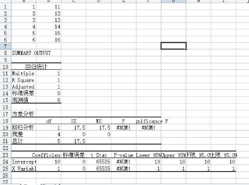 4、而我们所要的只是两个数据,就是单元格A24(=10)与A25(=1),假如我们设置的方程为y=ax+b,那么,a就是单元格A24的值,b就单元格A25的值:y=x+10。