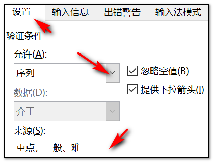 4、在弹出的对话框中,设置界面里在验证条件框里选择“序列”,在来源栏里根据实际需要输入内容,并且每种选择要用逗号隔开;