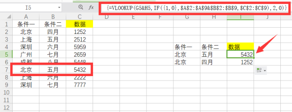 在I5单元格输入数组公式:=VLOOKUP(G5&H5,IF({1,0},$A$2:$A$9&$B$2:$B$9,$C$2:$C$9),2,0) 然后按按