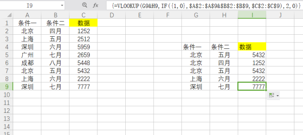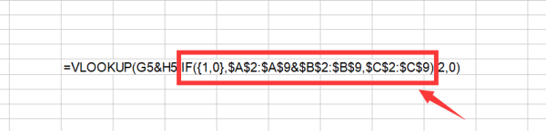 数据表:IF({1,0},$A$2:$A$9&$B$2:$B$9,$C$2:$C$9)表示需要查找的数据,这里面嵌套使用了IF函数,然后以IF({1,0},这样的数组参数。