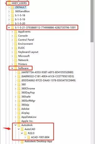 4、接着继续找到如下路径:【Software/Autodesk/AutoCAD/R22.0/ACAD-F001:804/】,然后点击【InfoCenter】,找到【InfoCenterOn】,将数值修改为【0】,保存。继续点击【FileNavExtensions】,找到右侧的【ACPROJECT】和【FTPSites】,分别删除,这样就OK了。