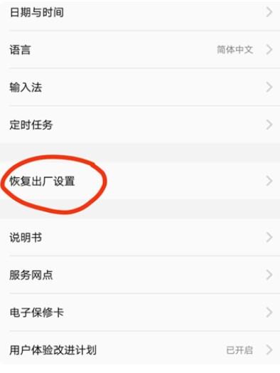 3、点击【恢复出厂设置】。手机恢复出厂设置就是将手机里面用户的所有信息、安装的应用以及下载的数据全部清空,恢复为出厂时的状态,类似电脑的一键还原。操作之前请确认你的重要资料已备份。