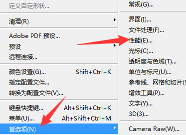 3.在【编辑】列表的下拉菜单中选择【首选项】,然后在子菜单中选择【性能】选项按钮。