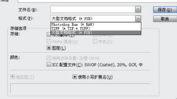 最高可保存长度和宽度不超过300000像素的图像文件,此格式用于文件大小超过2 Giga Bytes的文件,但只能在新版Photoshop中打开,其他软件以及旧版Photoshop不支持。