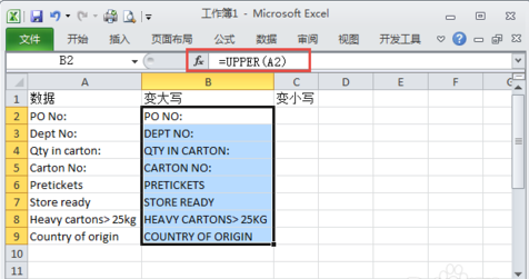 Ps:如果想将小写的英文字母转变为大写可以使用=Upper()函数。具体的步骤和上述一致。