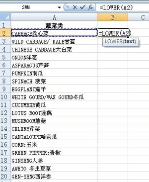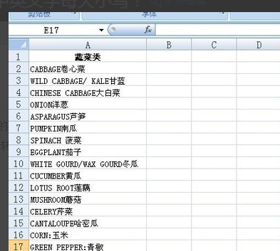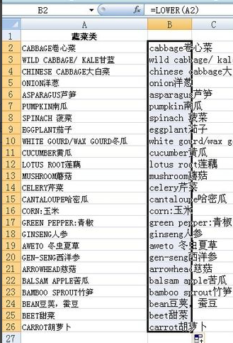 1,打开一份英文菜谱。列A的英文字母都是大写。现在需要将英文字母转变为全部小写字母。