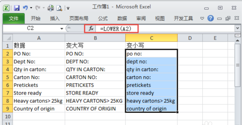 3.若要将单元格中的所有字母全部转换为小写形式,可以使用UPPER函数。