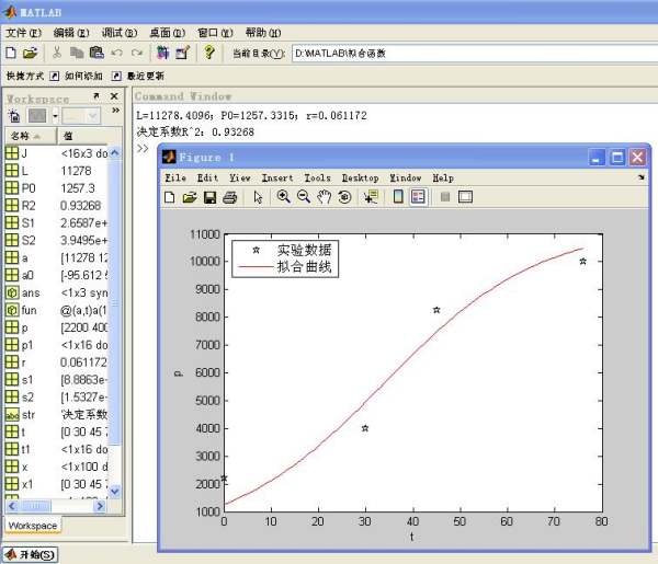 logistic模型属于非线性问题。所以求解其模型函数的系数可以用nlinfit()非线性回归分析函数来解决。由于给出的数据偏少,通过有效的插值方法,增加合理的数据点。主要代码: