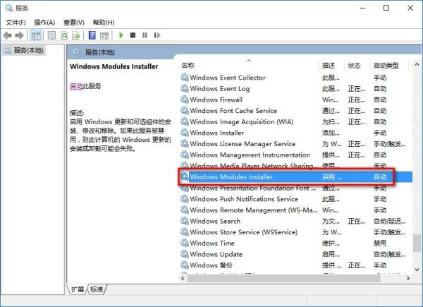 2、在服务(本地)窗口找到:Windows Modules Installer服务,查看是否被禁用。