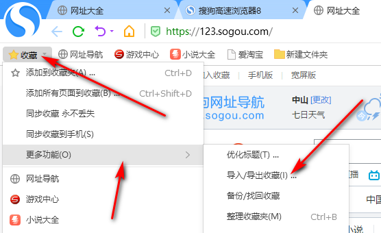 4、导出HTML文件后,打开另一个浏览器,点击收藏中的导入、导出功能。