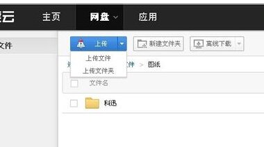 3、进入到要上传文件的文件夹以后,点击蓝色的上传按钮后面的小箭头,然后在下拉菜单上面选择上传文件或者上传文件夹;