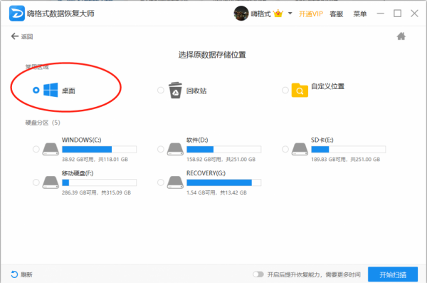 2、选择”原数据文件所存储的位置“,此处文件存储位置可直接选择对应数据误删除的磁盘,并点击下方”开始扫描“即可自动对丢失数据的磁盘进行扫描。