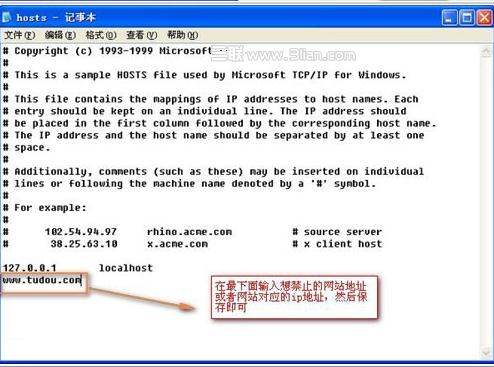 3、譬如:在最下面加入一行www.tudou.com其中www.tudou.com是想禁止访问的网址,当然也可以填入该网站对应的IP。这样禁止后,就无法访问该网站了。