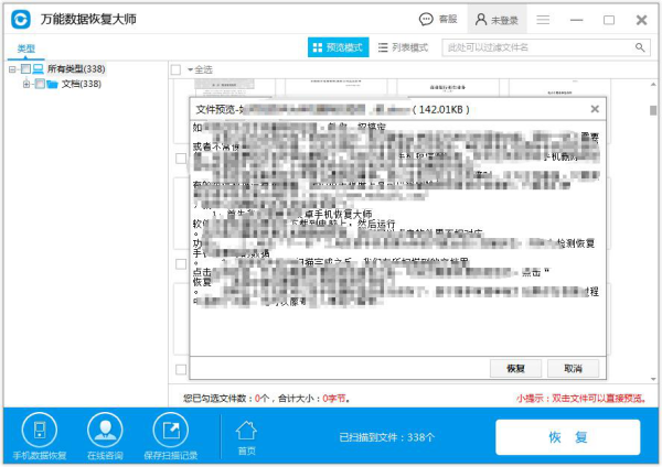 4、点击下一步,开始扫描数据,完成扫描后,界面上可以看到我们扫描出来的文件,找到被自己粉碎的文件,双击进入预览文件效果,是否是正常可以显示的,可以的话就把文件选择,并点击恢复按键,完成恢复。