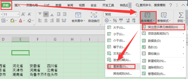 第二种方法:“开始”--->“条件格式”--->“突出显示单元格规则”--->“重复值”,将重复单元格标色后再打开数据--筛选,按颜色筛选。不带颜色是唯一值,带颜色的是重复值。