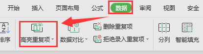 第一种方法:点击“数据”--->“高亮重复项”,选择要查找的数据,重复的数据就全部高亮显示出来了