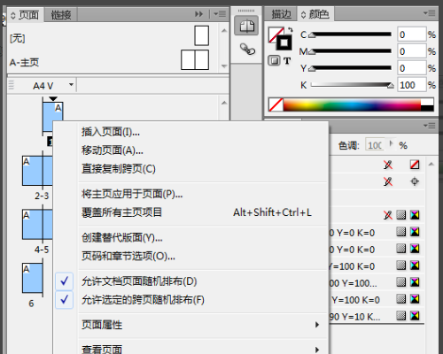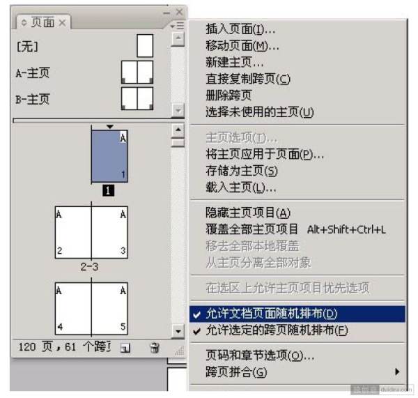 2、在“页面”窗口点击“页面1”上的小三角,全选所有页面,然后右击,取消“允许文档页面随机排布”前的对号。