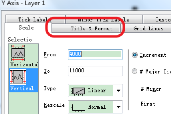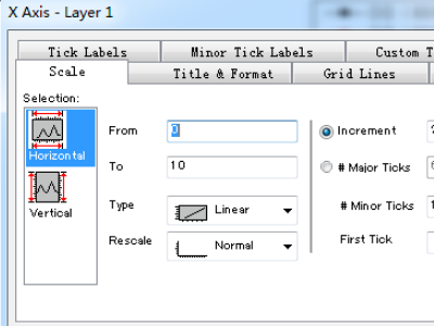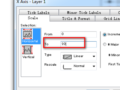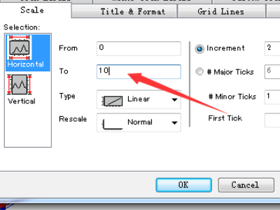 双击坐标轴后,在对话框中修改,如图,要修改Y轴的刻度,选择Vertical,要修改X轴,选择Horzontal。再相应的框内修改数值,如图中,将Increment的10修改为20后,Y轴的刻度增加会变为20。origin作图后如何更改横坐标