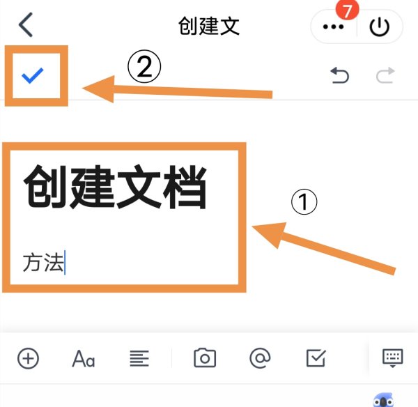 6.【输入】标题和内容,比如我输入的是创建文档和方法;再点击左上角的【√】,就创建成功了。