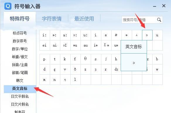 5、接着点击左边的“英文音标”,右边第一行倒数第二个符号就是了,点击它即可录入;